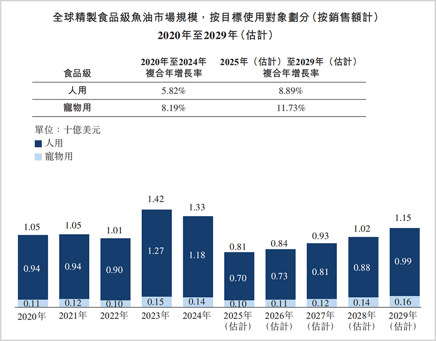 招股书显示,以销量额计算,2020年到2022年由于受到口罩事件影响人用食品级鱼油市场规模由9.4亿美元小幅下降到9亿美元,到2024年反弹至11.2亿美元,此后预计又将陷入低迷,到2029年才逐渐恢复至9.9亿美元,依然没有回到2024年的水平。