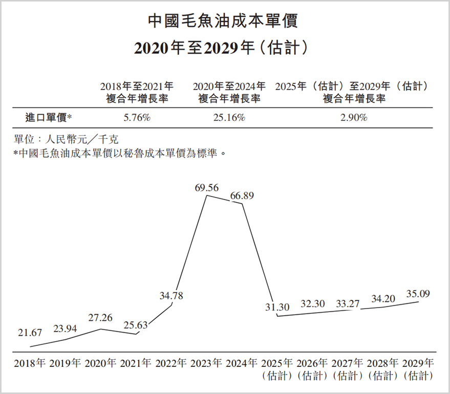 招股书显示,2018年以来国内毛鱼油成本进入了快速增长通道,2023年及2024年受到南美洲收紧捕捞配额及终端产品需求增加影响,成本单价达到了66元/千克以上,预估2025年会大幅回落。而毛利率大降更多源自此前采购的高价原材料。