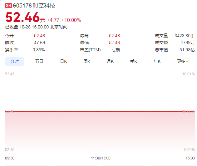 10月28日,时空科技开盘便一字板,迎来五连板,股价为52.46元/股。截至收盘,该股成交额为1799万元,最新A股总市值达51.98亿元。自2025年9月2日以来,时空科技股价累计涨幅高达135%,表现十分抢眼。