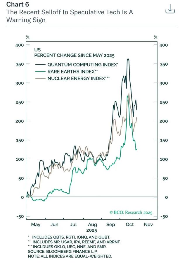 其次,受人工智能交易提振的投机性股票在最近几周遭到抛售。Berezin补充说,这是人工智能行业的另一个令人担忧的迹象,他指出,量子计算、稀土和核能股最近出现了下跌。