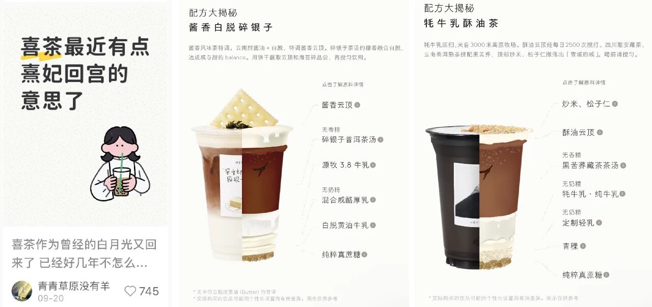 以喜茶为例,调转方向后,喜茶新品更加关注原料的独特性(如牦牛乳、黄油牛乳、藏茶、炒米、羽衣甘蓝等)和饮品的健康属性(选择新鲜蔬果、纯动物乳脂等原料,践行四真七零的品牌承诺)。一系列举措下,喜茶新品重回风味巅峰,被消费者评价为“喜妃回宫”。