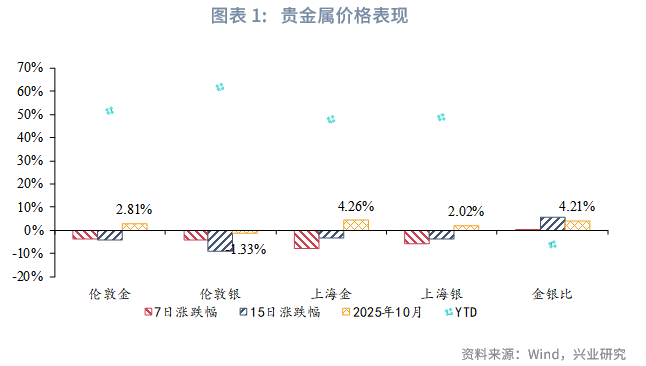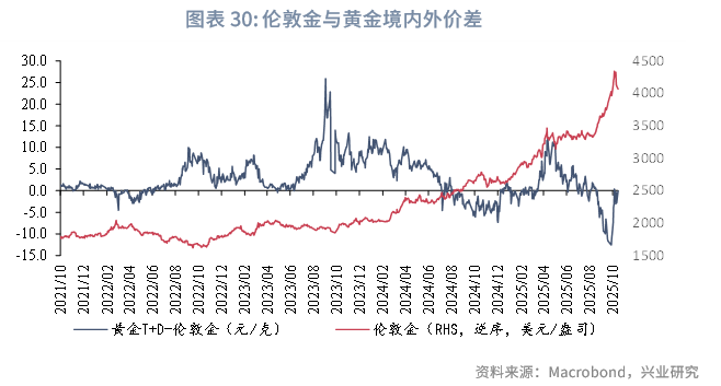 比价方面,2025年10月金银比反弹。价差方面,10月境内外价差快速由-10元/克修复至平价。