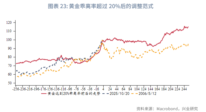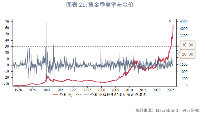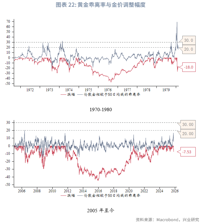 近期黄金50日乖离率最高达到16.7%,逼近20%,1970年以来,分别按照50日乖离率首次向上突破16.7%以及首次向上突破20%进行筛选,数据节点存在极高的重合性,故而我们选取更具代表性意义的20%整数位进行分析。1970年以来,黄金50日乖离率首次向上突破20%的数据节点共12个,多发生在1970至1980年代,2000年之后仅在2006年发生过一次。