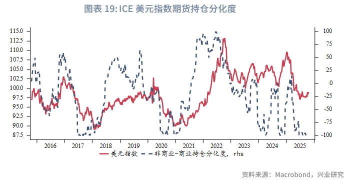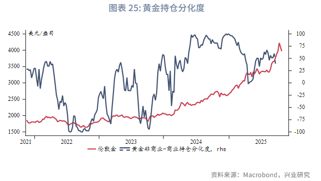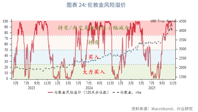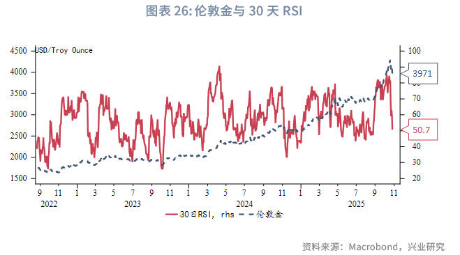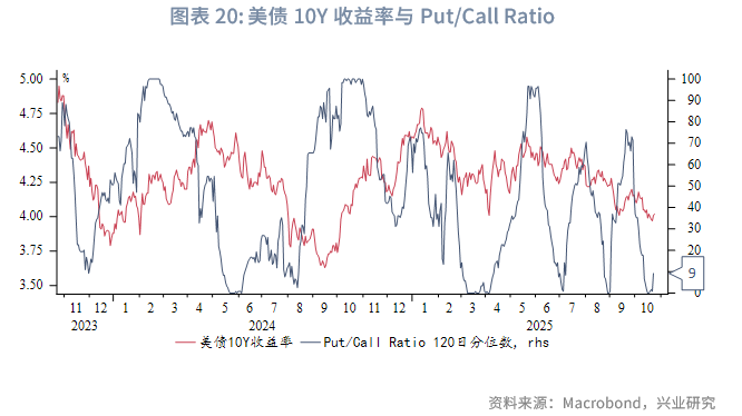 美国高频基本面进入弱势周期尾声,走弱程度有限。按4~6个月的短周期规律,11月基本面或逐渐好转。倘若此后公布的官方就业数据同样呈现韧性,可能引发市场对2026年降息路径重新定价,进而使得美元指数和美债收益率短线反弹,或至少难以流畅下行。从机构行为看,在美国政府关门前公布的9月末期货持仓显示美元指数持续处于超卖。美债期货Put/Call Ratio从近半年低位反弹。上述迹象也表明美元指数、美债收益率当前进一步下行的动力不足。对于黄金而言,目前美债票息+汇率收益重新转正,对投资者吸引力增强。