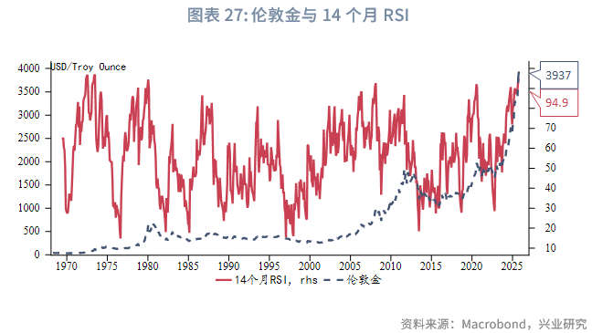 在《兴业研究商品报告:黄金大牛市回撤以及上涨规律分析20250512》中,我们提及当前处于2018年开启的牛市第5段(严格意义上是第4段)显著上涨波段,该波段自2023年10月起已持续超410天(按2025年5月12日计算)。当时我们判断仅参考历史走势,此轮显著上涨波段在当时结束或者再持续150至250天结束均有可能,故而从控制风险但不缺席牛市投资机会的双重考虑,自5月起我们一直提醒在估值合理的时候买入而不追高,是当前黄金投资中非常重要的操作纪律。截至10月28日,这一显著上涨波段已持续540日,10月27日盘中黄金距高点跌幅已超过10%,后在收盘时收回部分跌幅,最终距10月20日收盘高点下跌9.3%。其实无论2023年10月开启的强势上涨波段是否在当前结束(按收盘价跌幅大于10%来界定),黄金连续多年大幅上涨后,在当前位置进一步震荡整固或是向下调整清除冗余的多头仍是未来一段时间需要进行的。