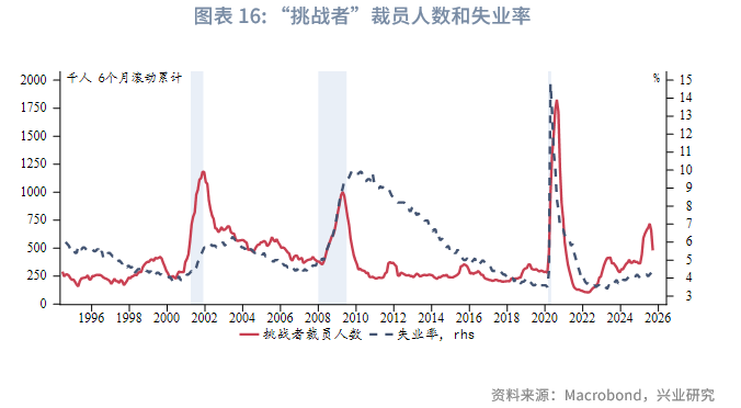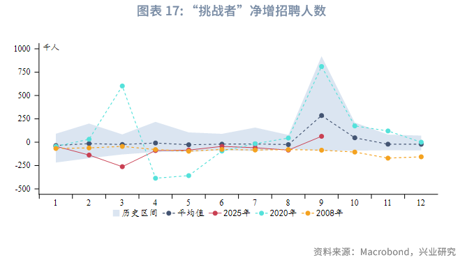 就业供需方面,根据“挑战者”的裁员人数和招聘人数计算净增就业人数,可以发现2025年净增就业较历史平均水平偏弱,不过在年初短暂下滑后已经重新企稳。