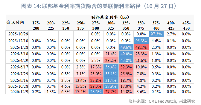 美联储政策重心由“物价稳定”转向“充分就业”,市场高度关注就业数据。美国政府关门导致就业数据缺失,市场延续此前就业降温的交易逻辑,保持对美联储年内再降息50bp的高度定价,对于明年再降息75bp的预期也保持稳定。然而,从私人部门数据看,美国就业市场或存在韧性。