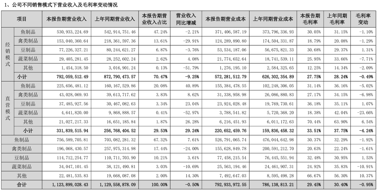 核心大单品“劲仔小鱼”是公司增长的主要动力,今年上半年,作为营收“压舱石”的鱼制品实现收入7.57亿元,同比增长7.61%,收入占比约为67.32%。