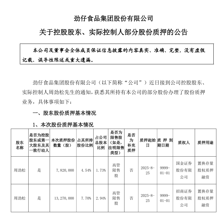 值得注意的是,披露半年报的同时,劲仔食品还发布了实控人股权质押公告。公告显示,劲仔食品实控人周劲松及其一致行动人李冰玉(周劲松之妻)合计持有公司20853.58万股、46.23%的股份,本次质押2109万股股份,质押用途为置换存量股权质押融资。