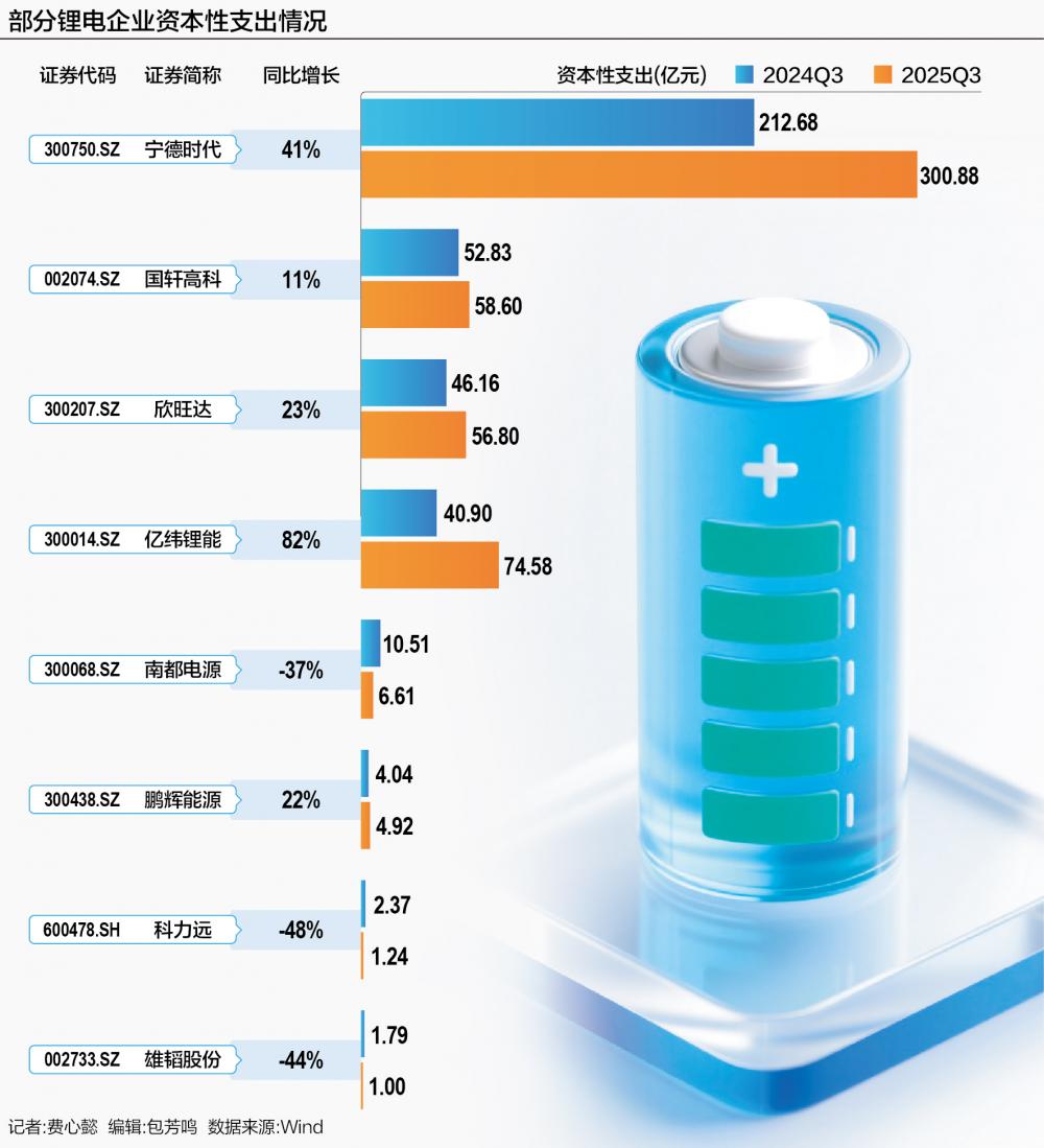 21世纪经济报道记者统计了8家上市锂电企业的资本性支出情况。