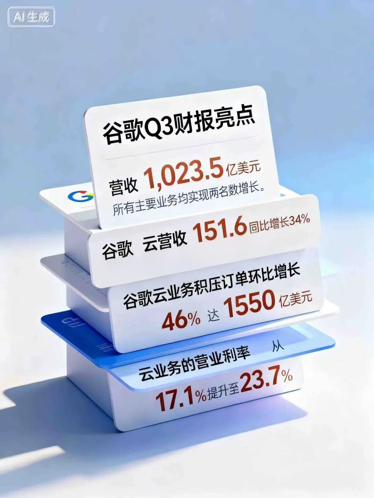 最大的亮点要数云业务——谷歌云营收151.6亿美元,同比增长达34%。财报电话会还透露,谷歌云业务积压订单环比增长46%达1550亿美元,2025年前9个月签署的10亿美元级别合同超过过去两年总和。#谷歌云业务增长