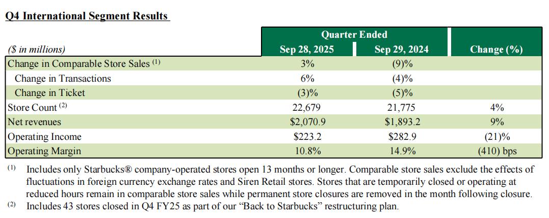 财报显示,2025财年,星巴克全球营收增长5%,第四季度全球同店销售额增长1%,这是其七个季度以来首次实现正增长。