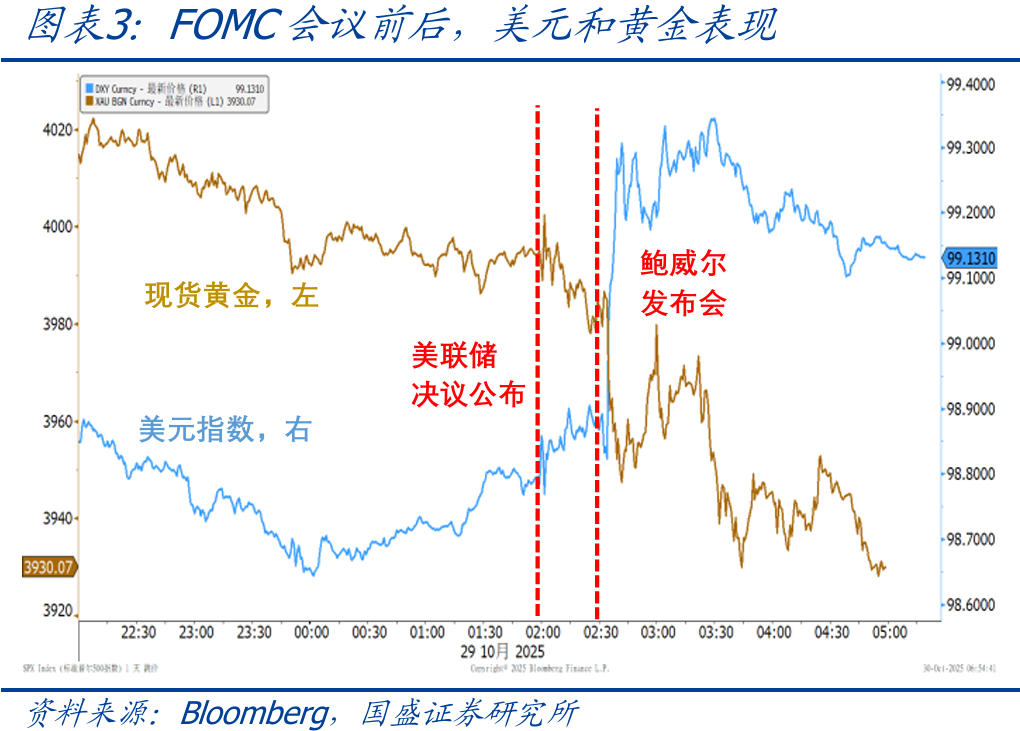 4、市场影响:市场此前对12月降息计价十分充分,本次会议后仍认为降息是大概率,若后续进一步坐实了12月不降息,短期内美股和黄金仍将面临调整压力,美债收益率和美元指数仍可能进一步走高。不过中长期看,市场对2026年降息空间的预期相对理性,这与我们的判断一致,因此等短期降息预期调整到位后,后续影响预计有限。
