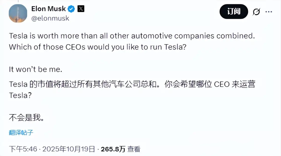 马斯克很快便在社交媒体上进行了反击,暗示特斯拉的市值比所有其他汽车公司的总和还要高,如果自己拿不到应有的报酬,可能不会继续担任特斯拉的CEO。