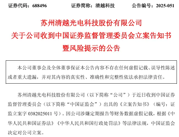 上周五傍晚,清越科技发布公告称,公司近日收到中国证监会出具的《立案告知书》。