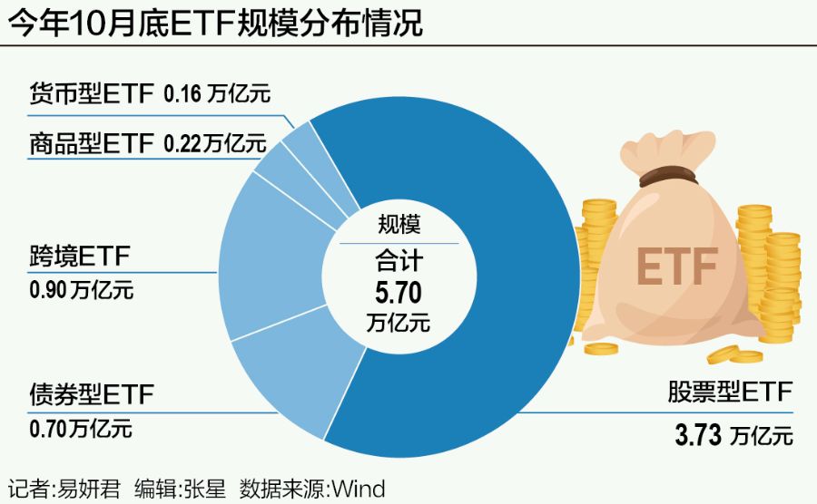 据Wind统计,截至10月31日,ETF市场的总规模(不含联接基金,下同)达到5.7万亿元,较2024年底增加了近2万亿元,增幅约为53%。