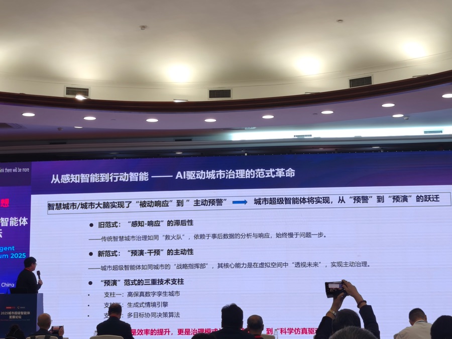 他认为,人工智能发展已从“感知智能”迈入“行动智能”阶段,聚焦在智慧城市领域,城市超级智能体正推动治理范式从传统的“感知-响应”滞后模式,向“预演-干预”的主动模式跃迁。