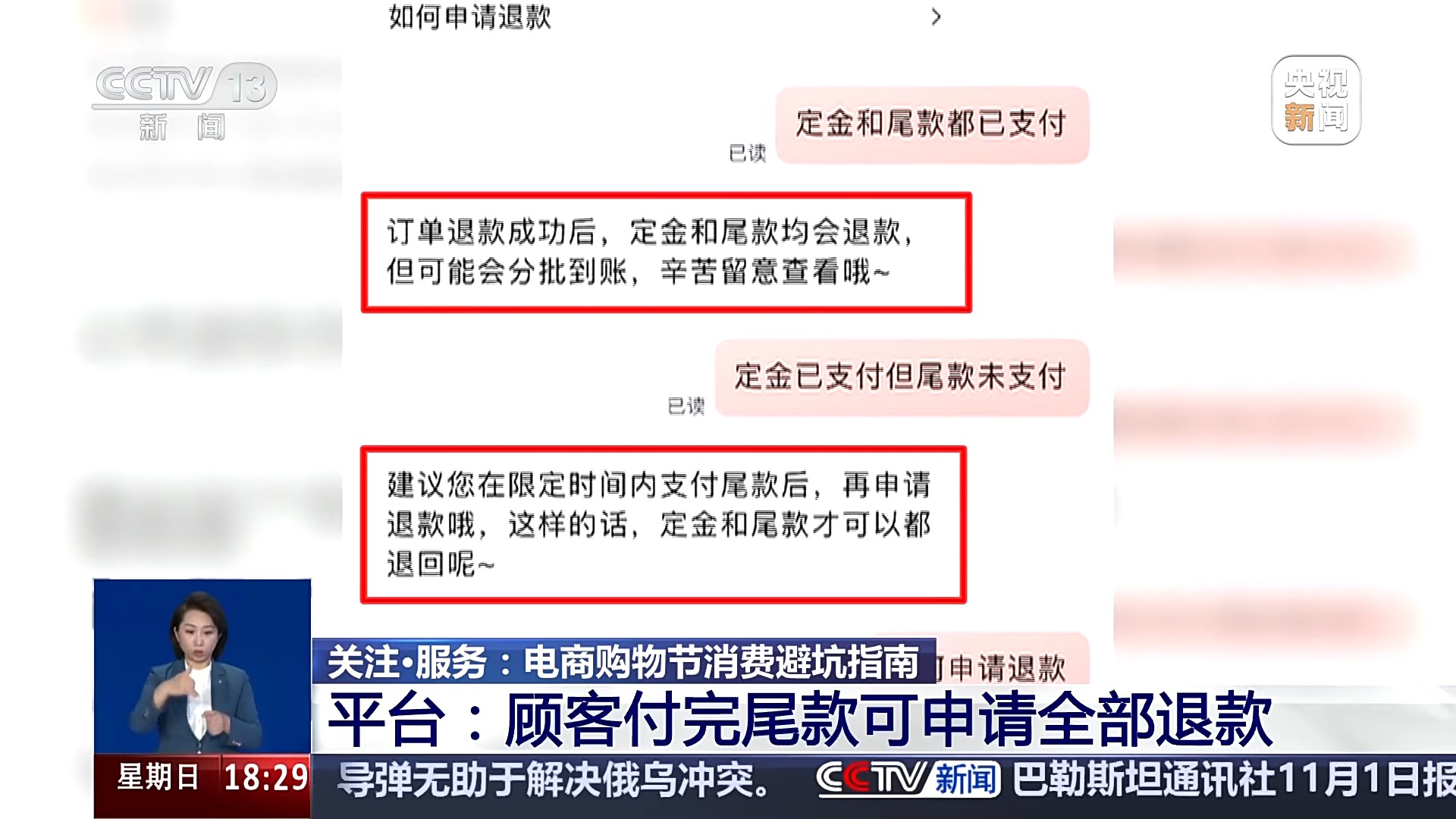 平台客服同时表示,如果消费者遇到尾款支付出现故障的情况,可以第一时间与平台和商家联系说明,由商家专门开设退款入口,退还“定金”。