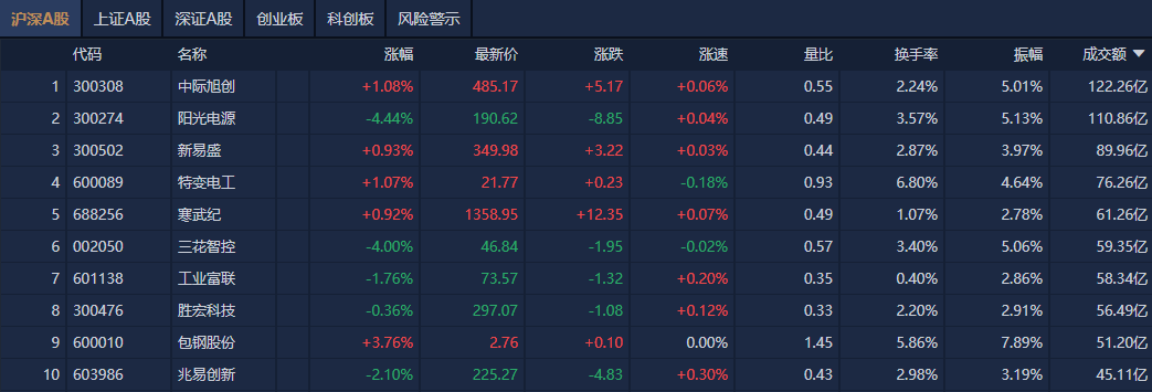 个股方面,中际旭创成交额超122亿元居首,阳光电源、新易盛、特变电工成交额靠前。
