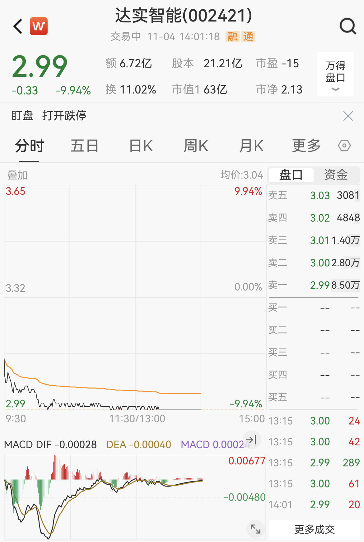 11月4日,智能物联网企业达实智能(002421.SZ)迎来成立30周年后的“危机时刻”。今日开盘后公司股价大幅下挫,盘中跌停,截至14时01分,报2.99元/股,市值缩水至63亿元。