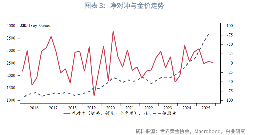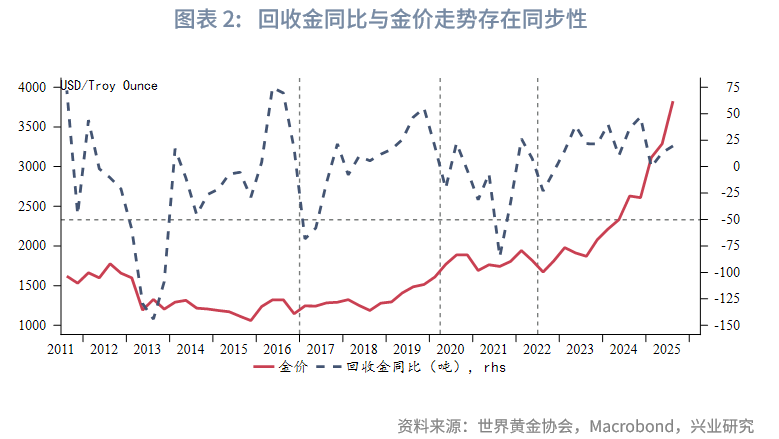 供给方面,2025年第三季度全球黄金总供应量同比增加37.1吨,同比上涨2.90%,矿山产量、回收金同比均衡增长,生产商净套保同比继续下降。其中矿山产量同比增长19.0吨,生产商净套保同比下降1.5吨,生产商净套保同比第一季度短暂同比增长后,此后连续两个季度同比继续回落。全球回收金量同比增加19.6吨,连续两个季度正增长。