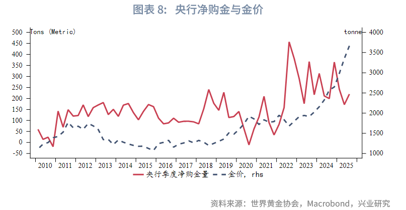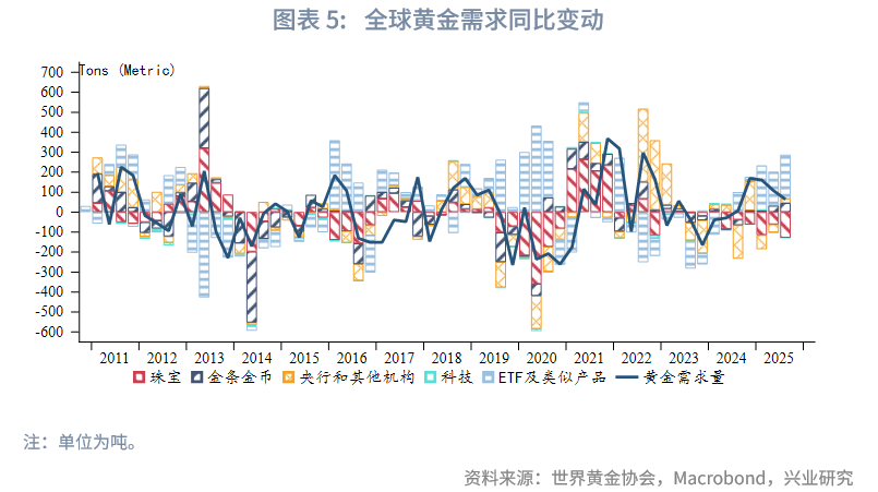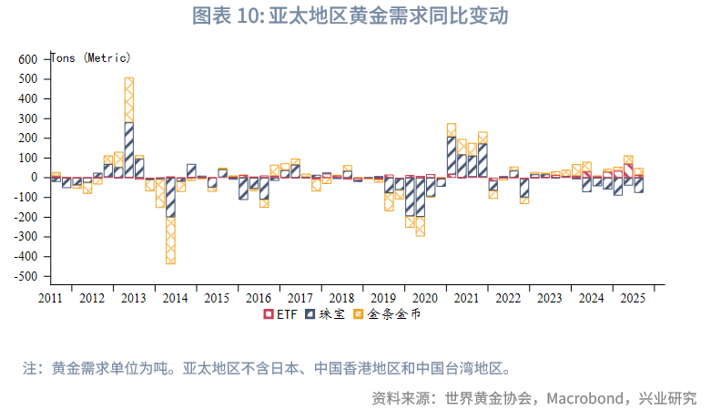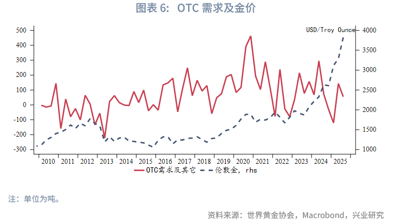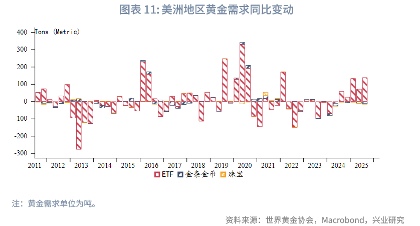 2025年第三季度全球黄金需求(不含OTC及其他)同比增加64.1吨,增幅环比回落。黄金ETF需求以及金条投资需求同比继续保持正增长,珠宝需求同比降幅扩大,央行购金同比和环比均回升。OTC及其他项中往往含有高净值客户及金融机构除了黄金ETF外的实物持金,这部分需求在2024年第四季度和2025年第一季度明显收缩后,2025年第二季度转为大幅回升,2025年第三季度继续扩张,环比有所回落。总体来看,第三季度央行购金意愿环比回升,高净值客户购入黄金意愿继续维持,黄金ETF和金条需求同样受到青睐。