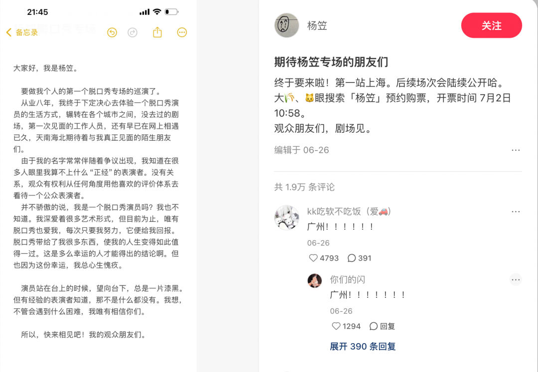 6月26日,杨笠在社交平台发文宣布,将开启个人的第一个脱口秀专场巡演。