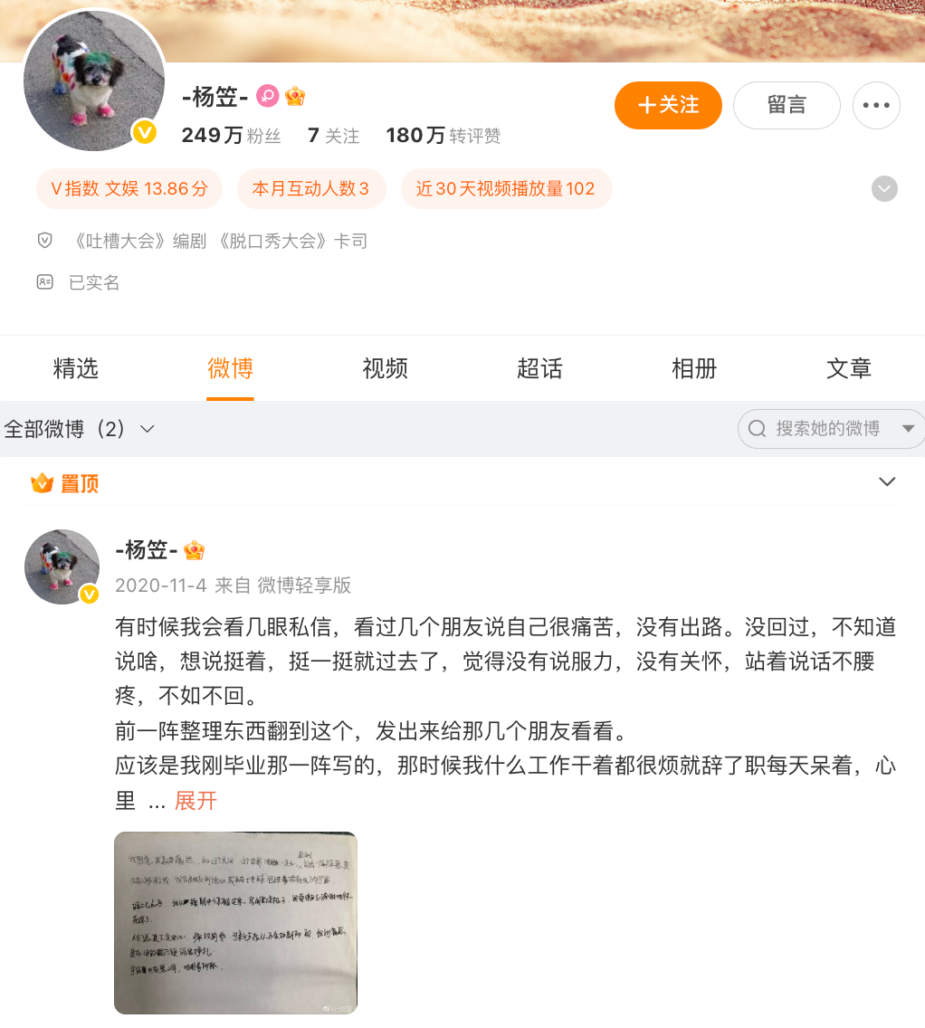 此外,杨笠的微博账号内容仅剩2条,除1条2020年11月发布的置顶微博可见,并无其他可查看内容,该账号目前粉丝数249万。