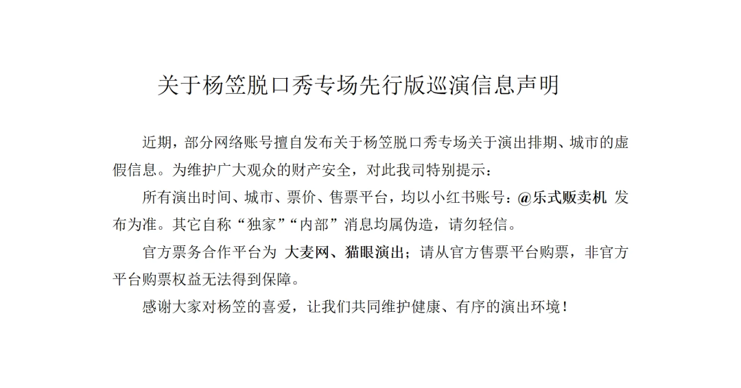 声明称:近期,部分网络账号擅自发布关于杨笠脱口秀专场关于演出排期、城市的虚假信息。为维护广大观众的财产安全,对此,我司特别提示:所有演出时间、城市、票价、售票平台,均以小红书账号“乐式贩卖机”发布为准。其它自称“独家”“内部”消息均属伪造,请勿轻信。