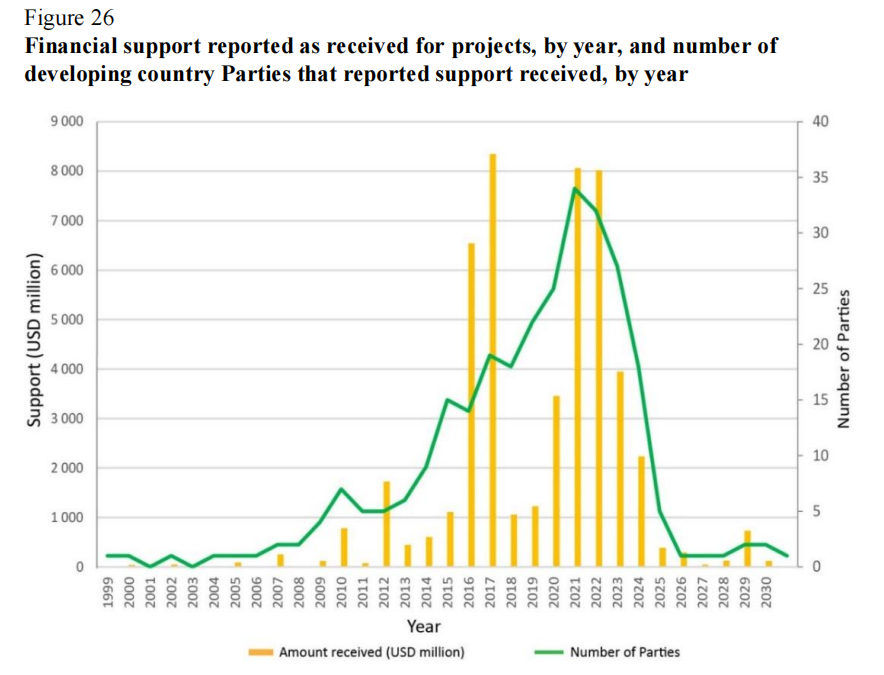 (历年项目获资情况与受援发展中国家数量,图源《双年透明度报告与国家温室气体清单综合报告》)