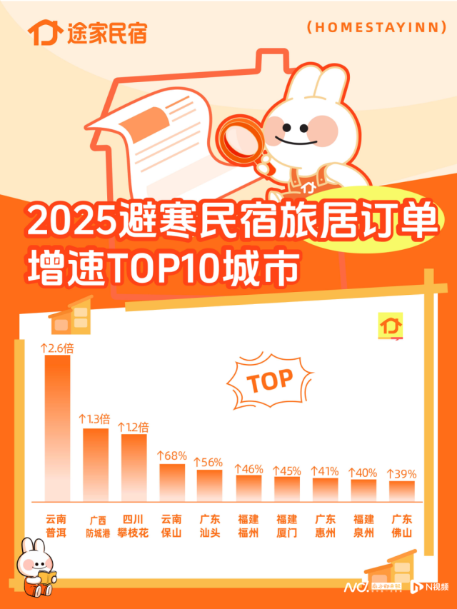 而旅居订单量增幅最高的城市则包括云南普洱、广西防城港、四川攀枝花、云南保山、广东汕头、福建福州、福建厦门、广东惠州、福建泉州、广东佛山。其中,普洱的旅居订单同比增长2.5倍;防城港和攀枝花的旅居订单均同比翻番,分别增长1.3倍和1.2倍。这些城市中,不少都是以往的“小众目的地”。以攀枝花为例,因冬季阳光充足、气候温暖,被称为“中国阳光花城”;防城港、惠州、普洱等地,则以更亲民的房价和悠闲的生活节奏,吸引着越来越多人前去旅居。