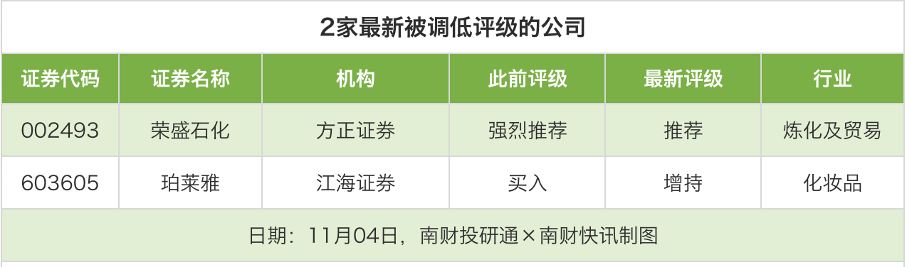 评级调低方面,11月4日,券商调低上市公司评级为2家次,最新数据包括了方正证券对荣盛石化的评级从“强烈推荐”调低至“推荐”,江海证券对珀莱雅的评级从“买入”调低至“增持”。