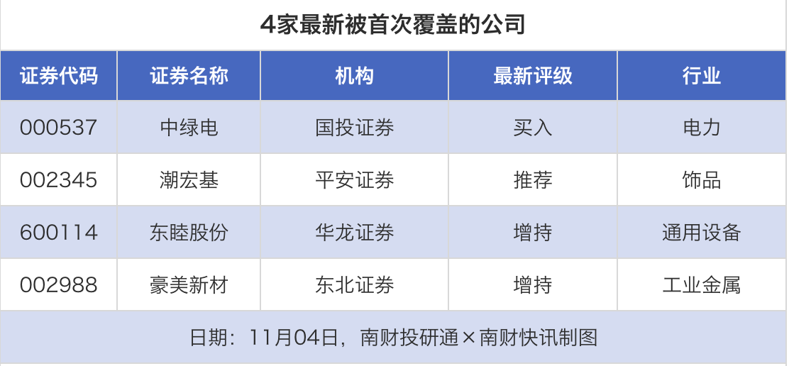 首次覆盖方面,11月4日券商共给出了4次首次覆盖。其中,中绿电获得国投证券给予“买入”评级,潮宏基获得平安证券给予“推荐”评级,东睦股份获得华龙证券给予“增持”评级,豪美新材获得东北证券给予“增持”评级。