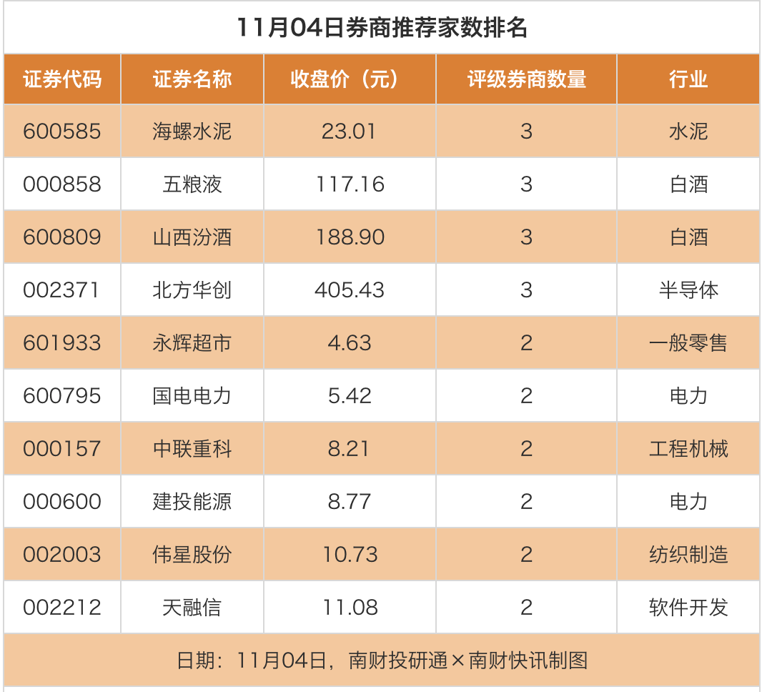 从券商推荐家数来看,11月4日有199家上市公司得到券商推荐,其中海螺水泥、五粮液、山西汾酒、北方华创等均获得3家推荐。