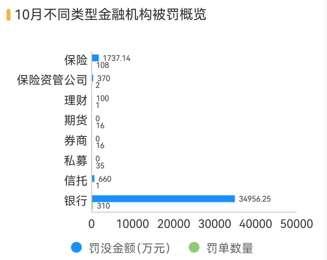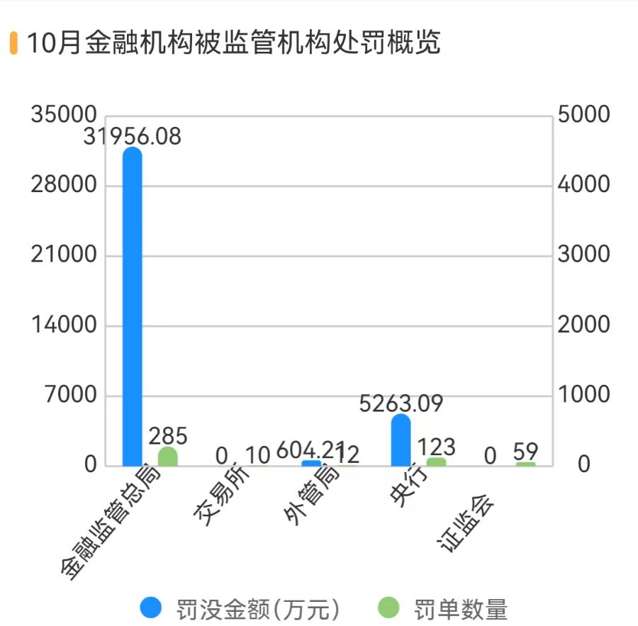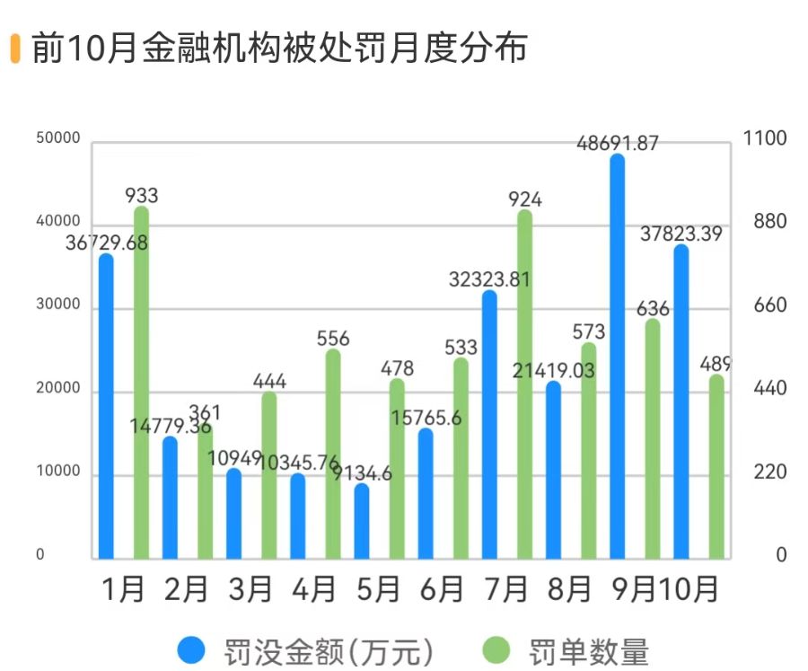 今年10月,金融机构共收到489张罚单,同比减少2.59%,合计罚没金额3.78亿元,同比大增223.08%。