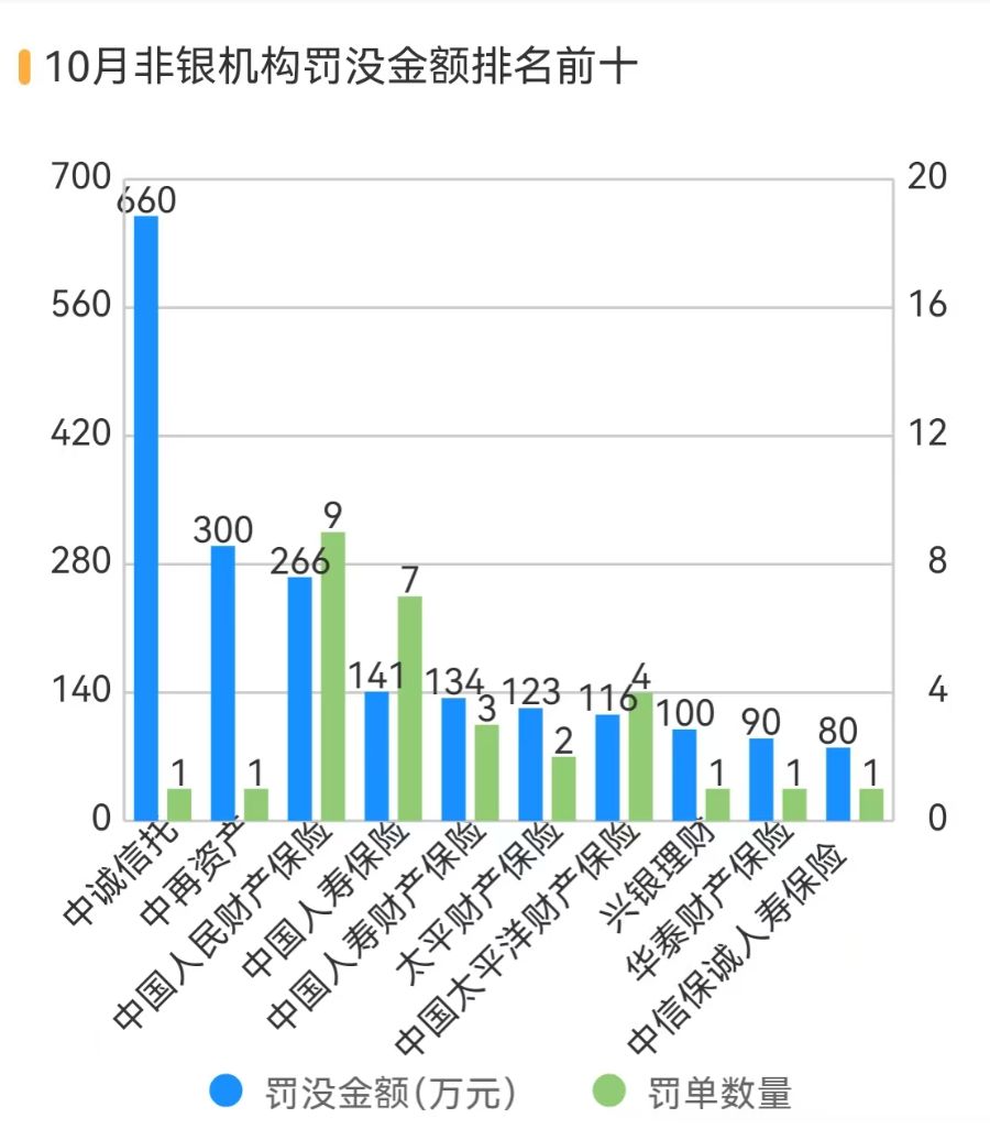 10月罚单数量相比前3个月明显减少,但合计罚没金额不算少,年内罚没金额第一高出现在9月,10月罚没金额仅次于9月,为年内第二高。