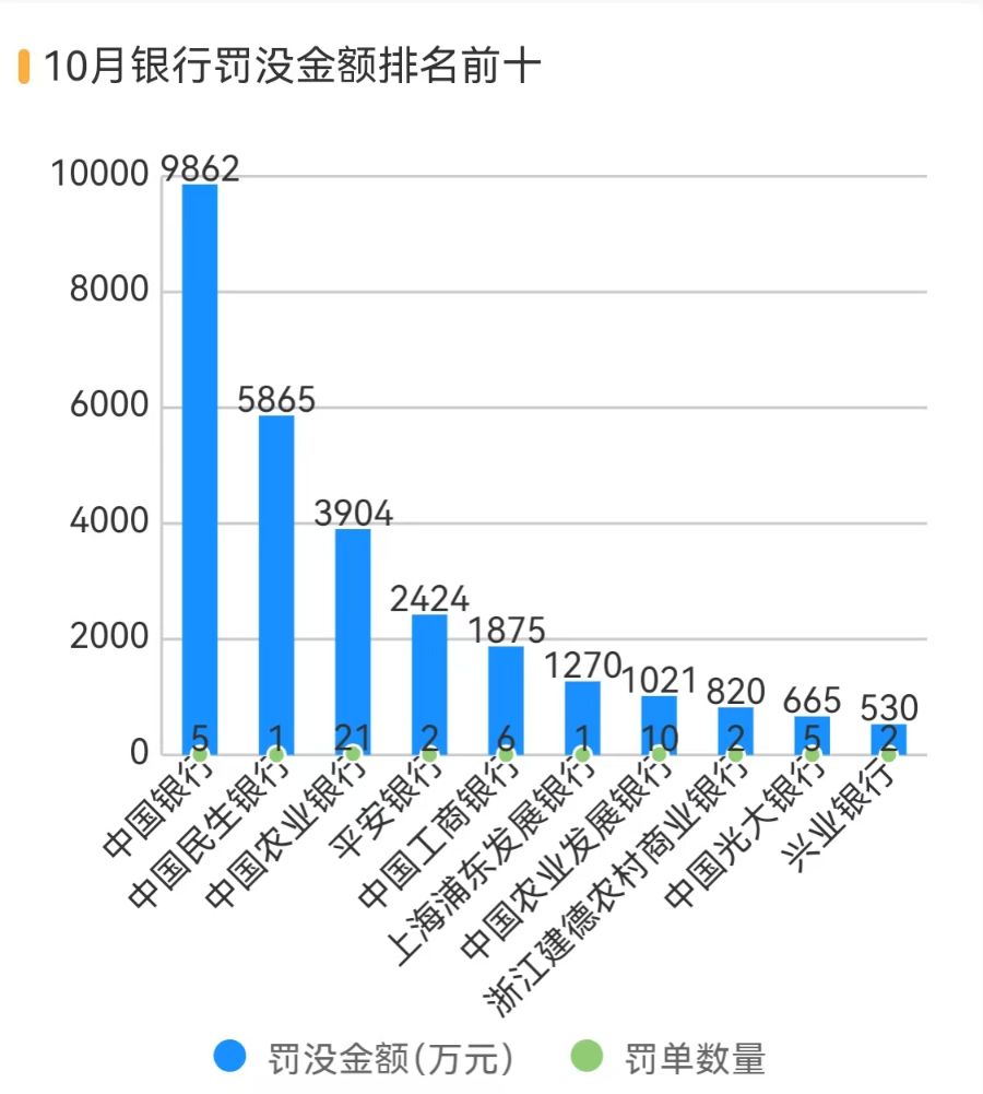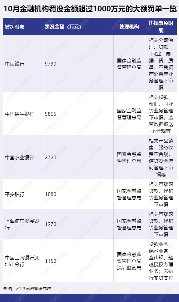 10月金融机构有6张罚单的罚没金额超过1000万元,收到10月最大罚单银行主要违法违规行为为相关公司治理、贷款、同业、票据、资产质量、不良资产处置等业务管理不审慎。