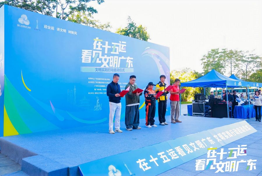 11月5日上午,“在十五运,看见文明广东”文明实践行动启动仪式在广州海珠区阅江路“最美7公里”路段举行。启动仪式上,广东籍短跑名将莫有雪、全国人大代表沈燕芬与“广州好人”代表共同发起《迎接十五运 共筑健康城》爱国卫生倡议,号召市民积极参与环境卫生整治,共同营造洁净优美的城市环境。美团、饿了么、京东等平台骑手代表与天河区沙东街道商会代表等行业卖场代表,共同宣读《文明骑行 从我做起》倡议,承诺自觉带头做到文明骑行,以身作则带动广大市民共同维护安全、畅通、有序的出行环境。