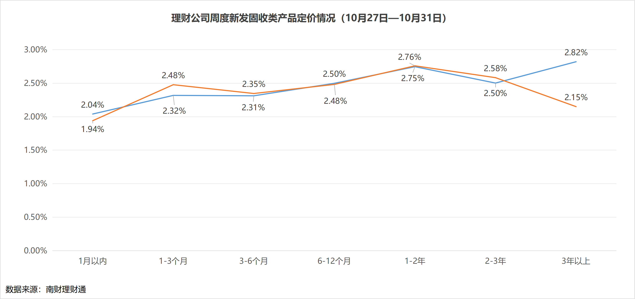 产品定价:上周,不同期限产品定价变动不一,3年以上期限产品定价提高至2.82%,扭转了期限产品定价倒挂的局面,1月以内期限产品定价环比提高了10BP到2%以上,为2.04%,1—3月期限产品定价降低了16BP,其余期限产品整体变动不大。