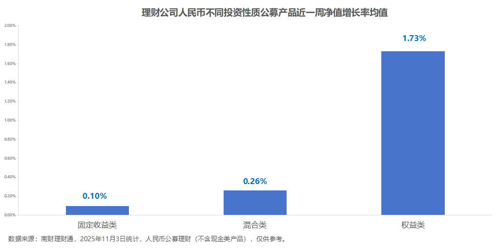 周度收益情况:整体上,截至11月3日,公募人民币理财产品近一周平均净值增长率为0.10%。其中,权益类理财近1周净值涨势最猛,平均净值涨1.73%;固定收益类、混合类理财近一周平均净值增长率分别为0.1%、0.26%。
