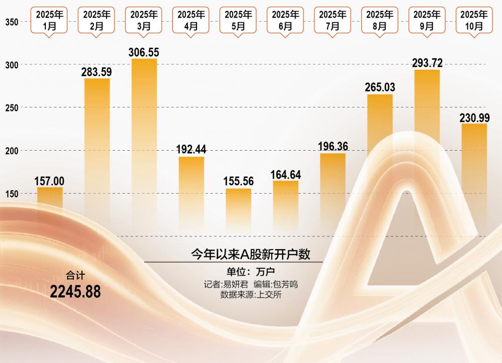 上交所官方数据显示,2025年10月,上交所A股新开户数为230.99万户。这意味着,今年前10个月,新增A股开户数达到2245.88万户,较去年同期增长了10.57%。
