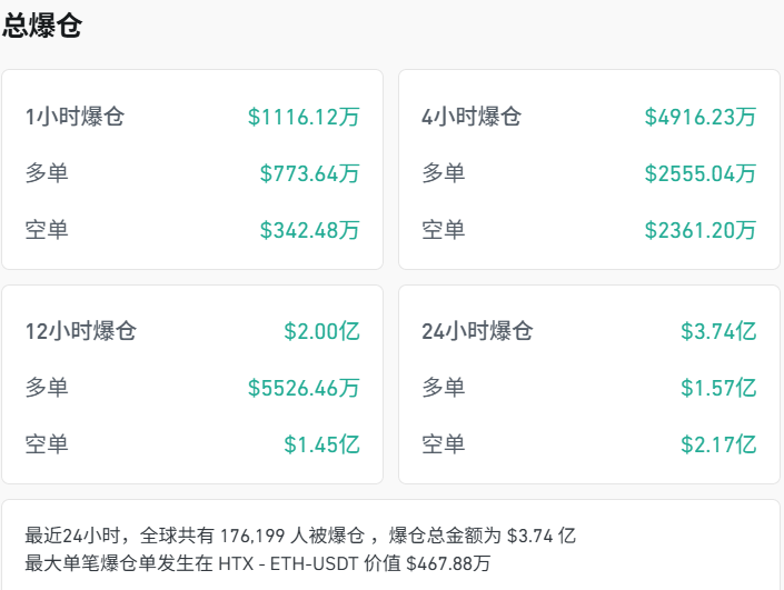 截至北京时间7:00左右,近24小时内,加密货币全线反弹,但成交额均大幅下跌20%—40%不等。其中比特币价格涨2.68%,以太坊、XRP涨超6%,SOL涨近5%。全市场超17.6万人被爆仓,爆仓金额3.74亿美元,其中多为空单爆仓。