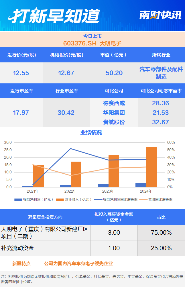 11月6日,有一只新股上市,为沪市主板的大明电子(603376.SH)。公司主营业务为提供汽车车身电子电器控制系统设计、开发、生产和销售的综合解决方案。公司前身为1989年成立的华夏无线电厂,1993年成功开发出车载收放机音量电位器,并正式进入汽车电子领域。