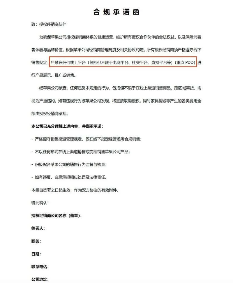 多家媒体证实,苹果中国区已向线下授权经销商发布“禁令”:禁止与任何电商平台合作,严禁在电商、社交、直播等线上平台展示、推广或销售苹果产品,连 “小时达”“一件达” 等即时零售服务也被纳入禁令。