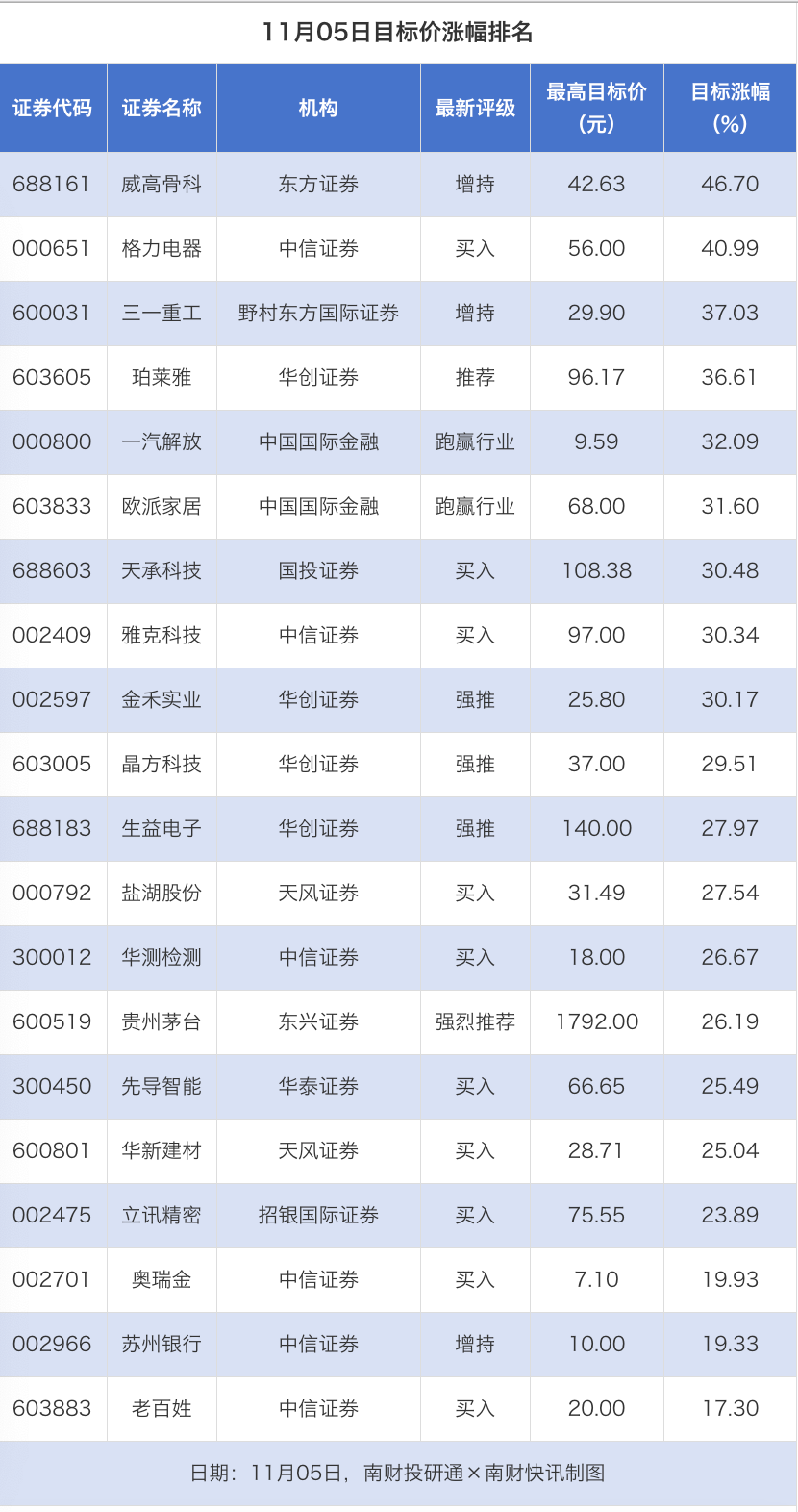 南财投研通数据显示,11月5日,券商给予上市公司目标价共26次,按最新收盘价计算,目标价涨幅排名居前的公司有威高骨科、格力电器、三一重工,目标价涨幅分别为46.70%、40.99%、37.03%,分别属于医疗器械、白色家电、工程机械行业。