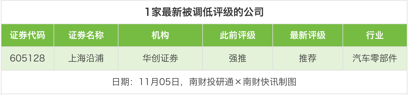 评级调低方面,11月5日,华创证券对上海沿浦的评级从“强推”调低至“推荐”。