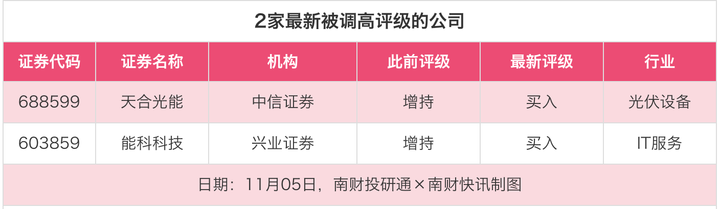评级调高方面,11月5日,中信证券对天合光能的评级从“增持”调高至“买入”,兴业证券对能科科技的评级从“增持”调高至“买入”。