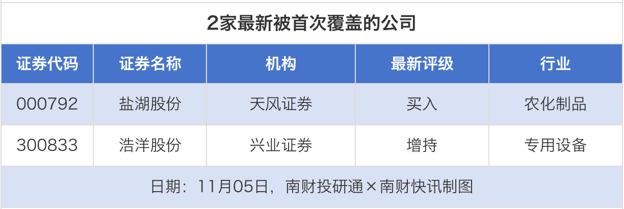 首次覆盖方面,11月5日,盐湖股份获得天风证券给予“买入”评级,浩洋股份获得兴业证券给予“增持”评级。