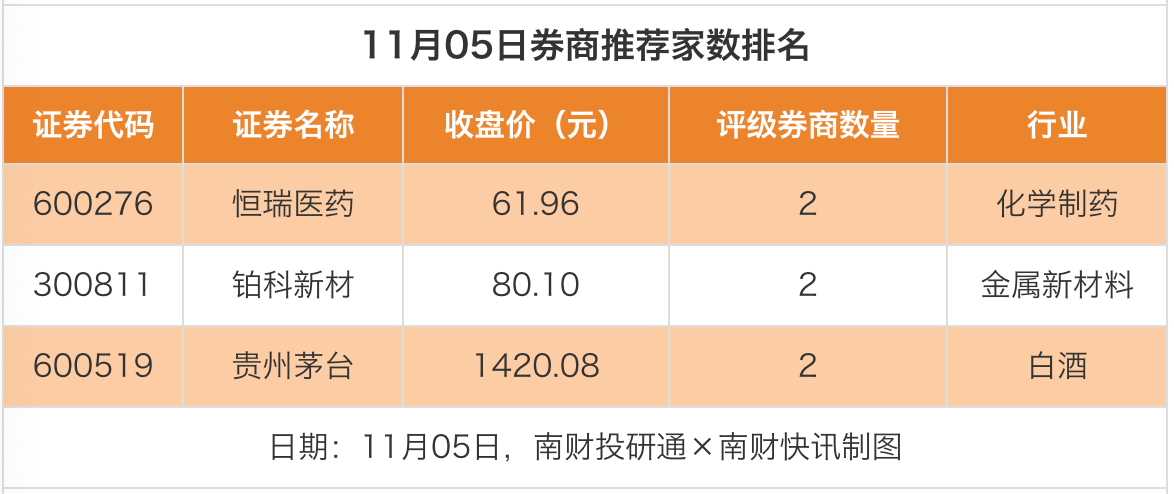 从券商推荐家数来看,11月5日有98家上市公司得到券商推荐,其中恒瑞医药、铂科新材、贵州茅台均获得2家推荐。