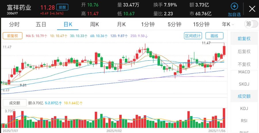 点评:富祥药业主营抗感染药物原料药、中间体、微生物蛋白,2025年三季度业绩下降,公司解释:主要受维护检修费用增加、部分产品市场需求及价格波动、收到的政府补助减少等多重因素影响。股价倒是挺坚挺的,4月份以来,走一个平缓的上升通道。相信市场炒的是他的电解液添加剂,锂电池概念。周四晚上公告“通过美国FDA现场检查”,多少也是利好。